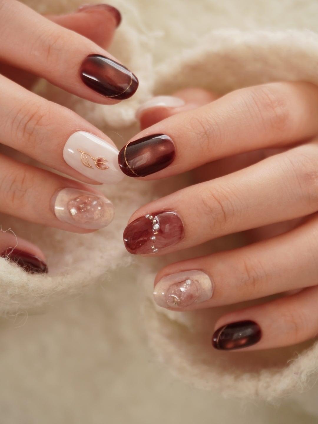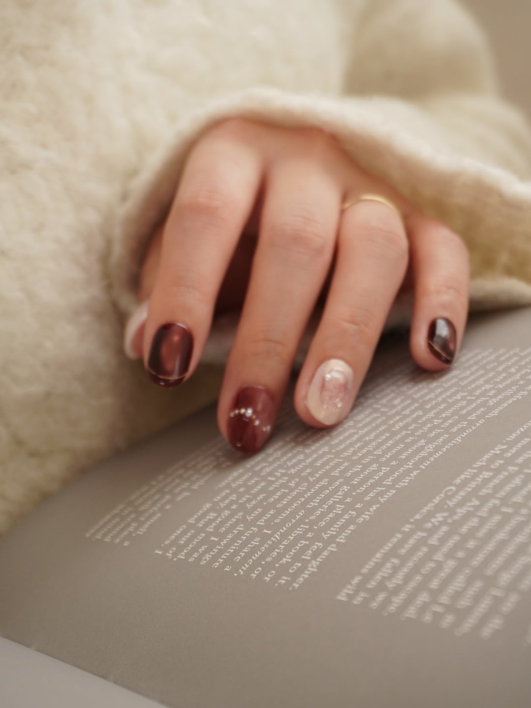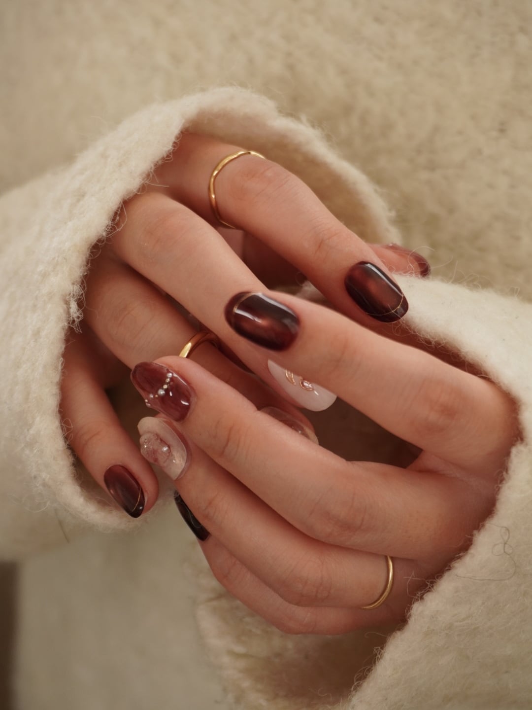 年間を通して人気の高い手書きのチューリップモチーフに、ボルドーよりも更に奥深い''ワインレッド''とランダムに光る''ビジューデザイン''を合わせました。